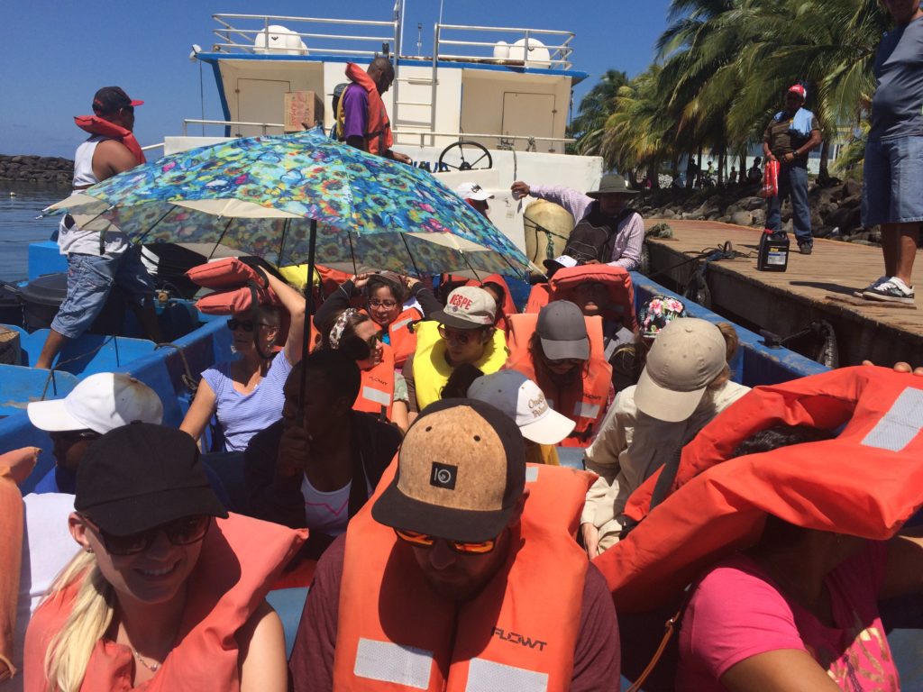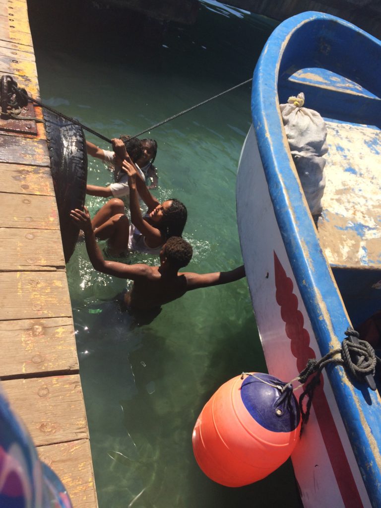 Früh morgens gings zum kleinen Hafen, dort fährt einmal täglich ein Boot nach Little Corn Island.  Hier warteten dann schon viele „Flugzeugtouristen“ und einheimische Kinder beim Planschen.